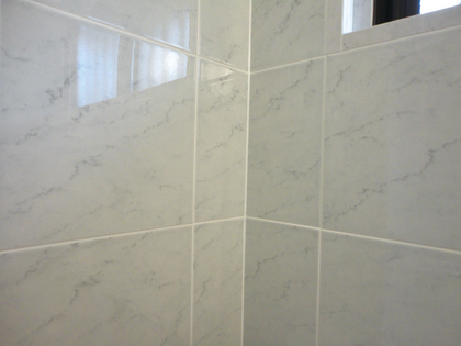 今回のタイル張りの浴室工事は、タイル目地の割り付けがポイントでした。