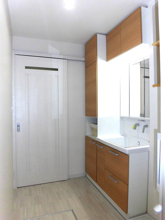 洗面所は、収納が増え、また引き出し式なので分別がし易くなりました。洗面ボールも広くなり、明るく使いやすい洗面所となりました。