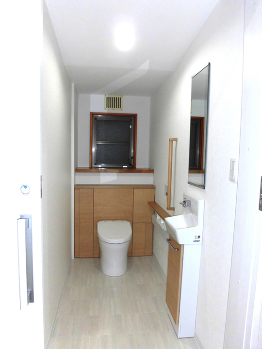 トイレは、タンクが隠れて、収納もすっきりできる節水型トイレになりました。入口も引き戸で出入りが楽にできます。