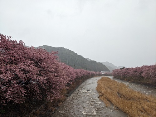 晴れていれば、きっと鮮やかなピンク色の河津桜が楽しめたのでしょう。
