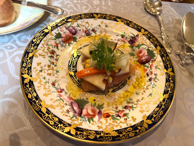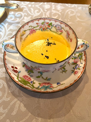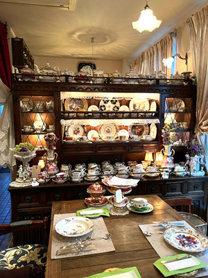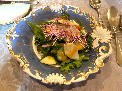 お店の中は、一歩入ると美術館かどこかのお屋敷に来たようです。さらにすごいのが、お料理もアンティークのお皿やカップで次々出てきます。メンバーそれぞれがみんな違うデザインの食器なので、それはテーブルがきれいでした。
