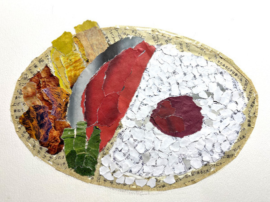 小さな画用紙やハガキなどに、うすく鉛筆で軽く形を描き、あとは新聞の中から、ほしい色をさがして、手でちぎってのりで貼っていきます。はじめはベースなので大雑把に色を敷き、上にだんだん細かい色を様子をみながら貼っていきます。おもしろいのは、別に食べ物の写真を使わなくてもいいところです。例えば、写真のお弁当を作ってみたのですが、鮭は何かのドレスの写真でした。野菜は、森だったり、意外なものが質感がぴったりだったりして、素材探しが楽しいです。文字があってもそれがまたかわいい。