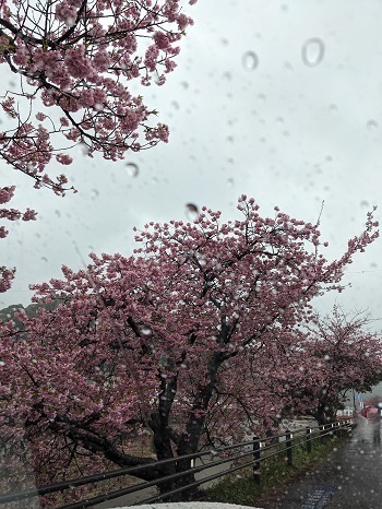 ほんとうは川沿いの満開の河津桜を眺めながら、並木道をゆっくり歩く予定でしたが、大雨に加えて風も強く、結局、車の外に出ることもできず、車の中からのお花見になってしまいました (-_-)