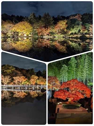 園内は多くの人で賑わい、イチョウ並木もとても美しかったのですが、特に印象的だったのは「日本庭園」エリアの紅葉です。暗闇の中、池の水面にライトアップされた紅葉が映り込み、まるで現実とは思えないほど鮮やかで幻想的な光景でした。