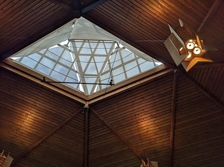 建築家の吉村順三さんが設計した木造建築のホールで、六角形の形をしたホール内は天井も床も壁も全て木でできており、天窓からは自然の光が差し込み、まるで教会のような雰囲気のホールです。舞台の背面と側面にはガラス窓が広がり、外の美しい緑が鮮やかに見えます。
