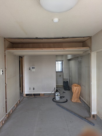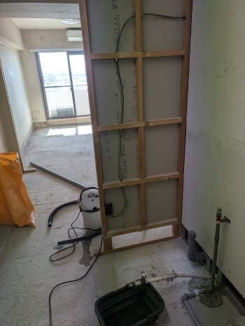まずは水廻りや床の解体が終わったところで古くなった水道管の入れ替えの配管ルートを水道の職人さんと検討していきます。
