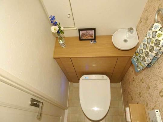 手洗い器や収納などの部材を設置して完成です。