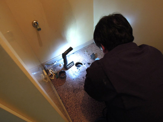 水道職人が廊下などを養生をして、古いトイレを取外します。