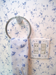 壁紙は憧れのクラッシックな青い小花模様。インテリアはブルーと白でまとめました。
