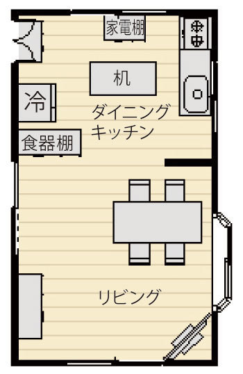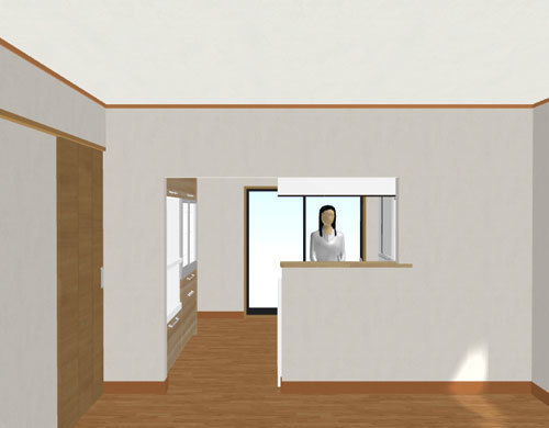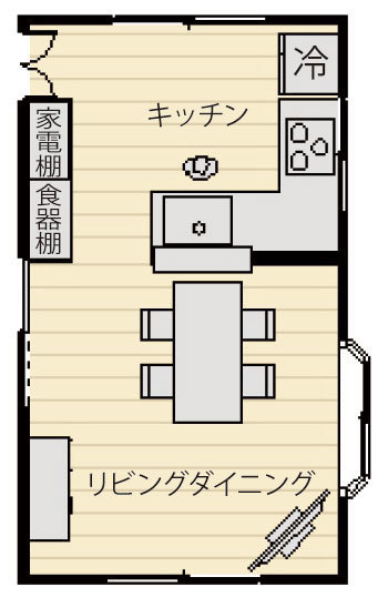 もとは、かつてよく設置されていた「流し台型キッチン」でした。ガスと流しの距離が近いため家事がしづらく、また冷蔵庫や食器棚の置き場もまとまらず、家具で大きな窓がふさがれている状態でした。
