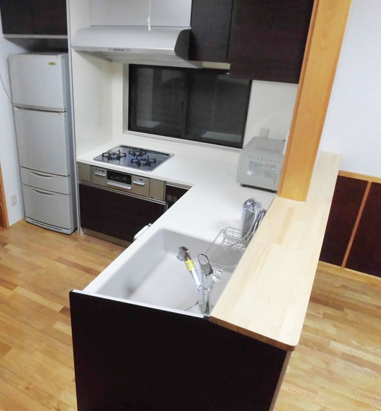 | 工事内容 | 都市ガス引込み、キッチン解体、搬出処分、配管工事、壁・カウンター造作工事、キッチン組立、電気工事、水道工事、ガス工事、内装工事、給湯器設置 |