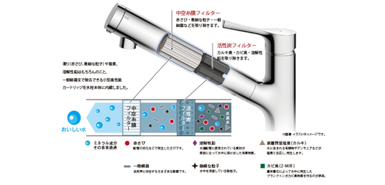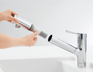 小型カートリッジが水栓金具に内蔵されているため、水栓を取り換えるだけで、浄水器を使用できるようになります。浄水カートリッジ交換もご自身で簡単にできます。カートリッジの交換目安は約4ヶ月で、交換カートリッジの価格は1本約4000円です。