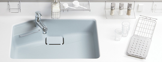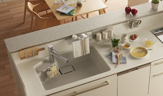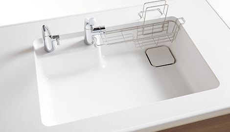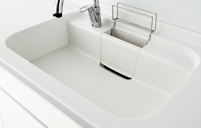 カウンターや排水口との段差のない一体成形、ゴミ受けの工夫などがされています。