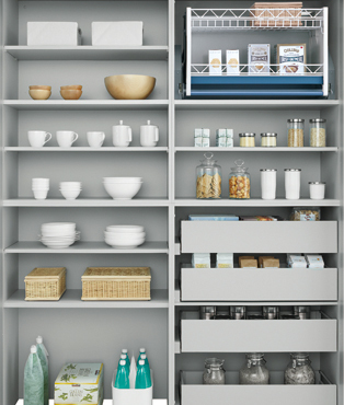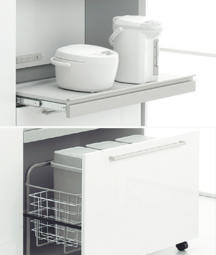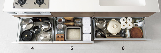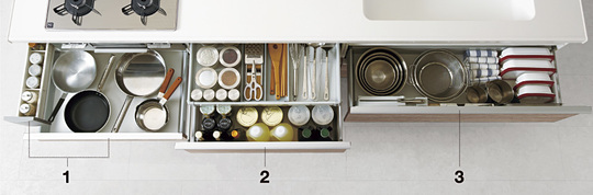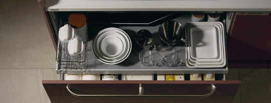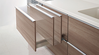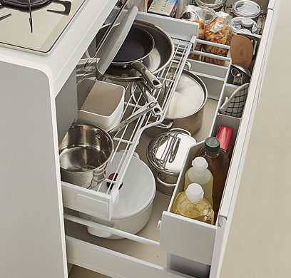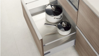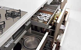 キッチンでは調理器具や食品など多くの物を毎日出し入れします。最新のキッチンでは、キッチン用品を使いやすくたっぷり効率的に収納するキャビネットが設置されています。収納しやすく、ものが取り出しやすい引き出し式が主流で、少ない力で楽に引き出せる構造になっています。