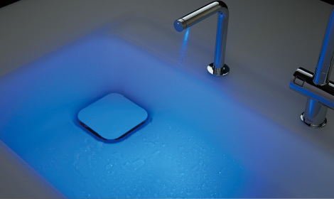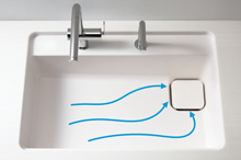 シンクの底に3°の傾斜を設定し、排水口を角に寄せたことで、水がスムーズに流れます。