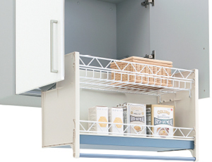 高い位置の棚は昇降タイプが便利。バーを引くと楽な力で降ろすことができます。