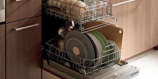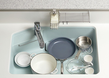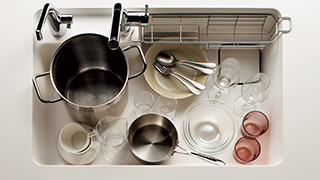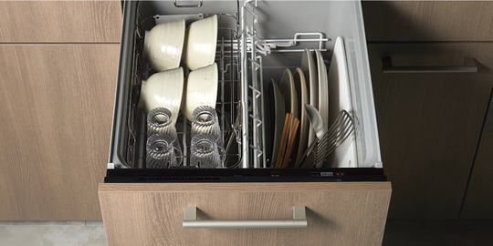 システムキッチンにはビルトイン食洗機が設置できます。収納部に格納されているので、外から見えず調理スペースが広く使えスッキリとしたキッチンになります。また上から食器が出し入れできるので、動作が楽です。