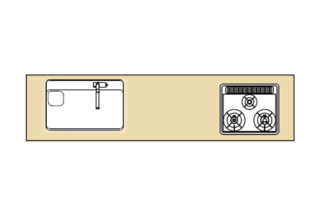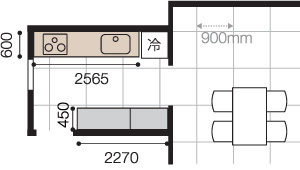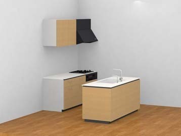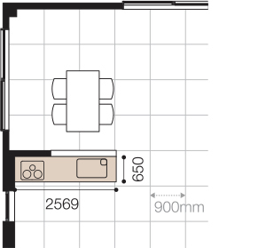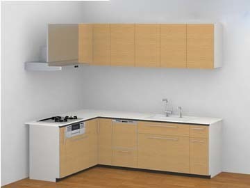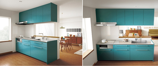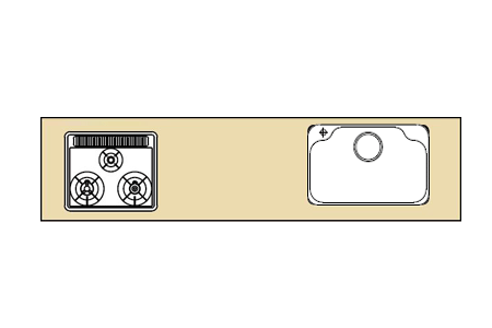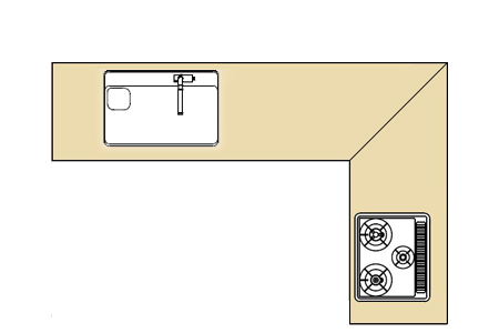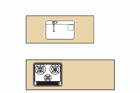 シンク、コンロ、調理スペースが一列に並んだシンプルな形です。平行移動のみで移動できるので、効率的に作業ができます。また場所も取らないので狭いスペースにも設置できる基本の形です。