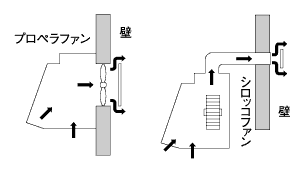壁の換気扇やシロッコファンを大きなカバーで覆ったものです。以前はこのタイプが多く使われていました。