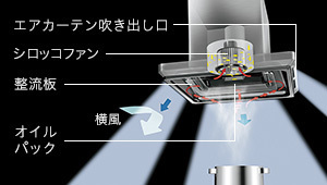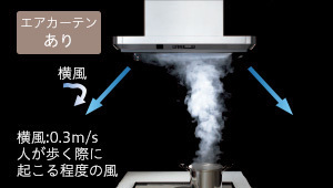 レンジフード側面から風を発生させ、周囲に空気の壁(エアカーテン)を形成。室内の風の影響を受けにくくし、調理中の油煙を吸い込みます。調理のにおいが広がらず、リビングやダイニングの快適さを守ります。目詰まりを起こすフィルターがないので、吸い込む力が落ちません。