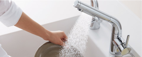 最近の水栓には、節水効果の高い水流、ハンドシャワー、浄水器付き、水の出し止めがワンタッチでできるものなどさまざまな機能があります。