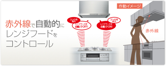 コンロとレンジフードが連動に対応している機種では、赤外線で自動的にレンジフードをコントロールできます。