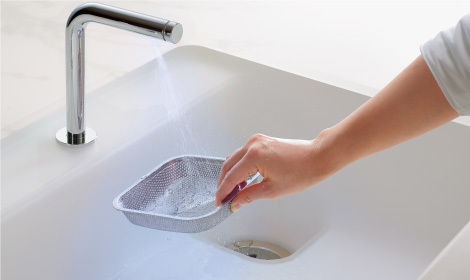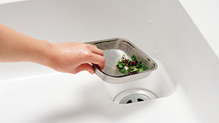 一体成形のため排水口のお手入れも簡単です。浅いゴミ受けで、ゴミを手軽に片付けられます。 TOTO