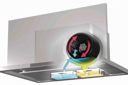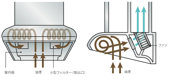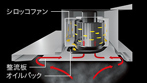 フィルターがなく、油煙が直接シロッコファンにぶつかり、遠心分離で油や汚れを集め、専用トレーに回収します。トレーのお掃除だけで済むので簡単です。
