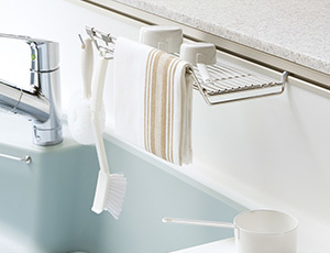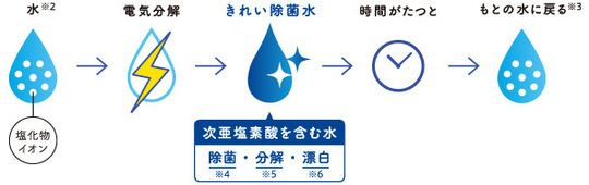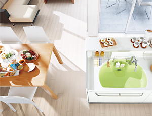 「きれい除菌水」は、飲料水に含まれる塩化物イオンを電気分解して作られる除菌成分(次亜塩素酸)を含む水です。薬品や洗剤を使わず、水から作られます。ヌメリや黄ばみを抑制します。除菌水が出てくる専用水栓がついているキッチン(TOTOクラッソ)を設置することで使用できます。