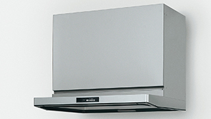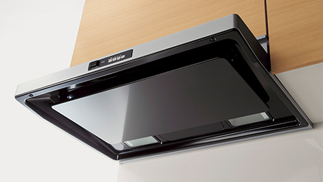 最新型レンジフード。凹凸がほとんどない内部構造で、フィルターのない構造のものも多くお掃除が楽です。現在、新しく取付ける場合は、このタイプが主流です。