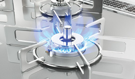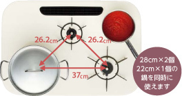 バーナーの間隔を広げた設計で、大きな鍋とフライパンや仮置きまでゆったりと使えます。
