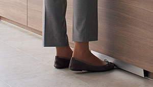 水栓のハンドルを好みの位置にセットして、足元のバー状のスイッチで水の出し止めができる仕組みです。毎回の手元ハンドル操作が不要になり、キッチン作業がスムーズに。こまめな止水で節水効果もアップします。うっかり出しっぱなしにしていても、約10分間で自動で止水します。