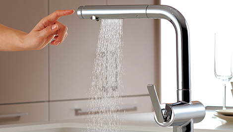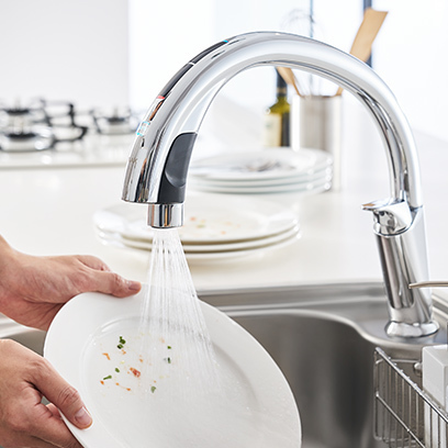 センサーで反応するので吐水も止水も操作がいりません。効果的に節水できます。