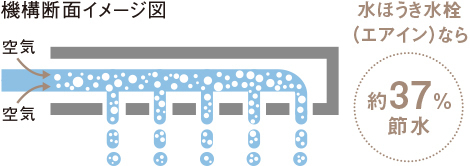 水に空気を含ませることで、水粒の一粒一粒をボリュームアップ。少ない水でしっかり洗え、節水効果を高めます。