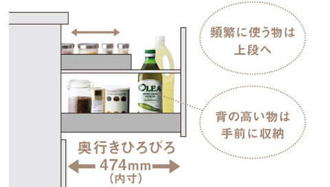 よく使うものを、上段に収納。背の高い調味料などもいれられるので、調理中にすぐ取り出せます。
