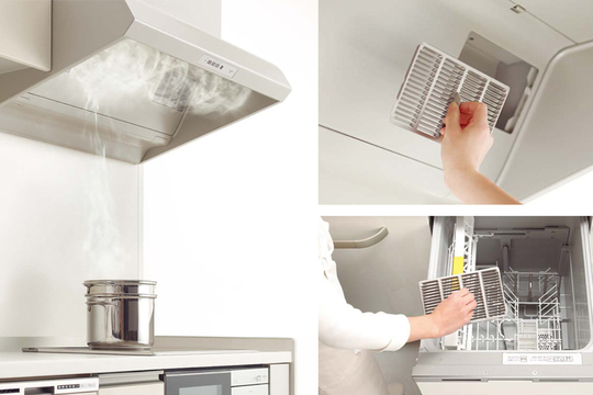 換気扇はコンロの上に不可欠ですが、一番汚れがたまりやすいところです。手の届きにくい油汚れには苦労されている方も多いのではないでしょうか。最近では、お掃除のしやすい換気扇がいろいろと開発されています。