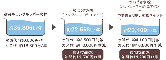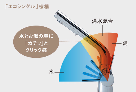 水とお湯の境にクリック感を設けることでお湯のムダ使いを抑えます。