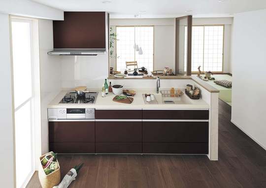 メリットは、調理しながらも家族とのコミュニケーションを取りやすく、配膳が効率的にできます。独立型よりも開放的な空間になります。オープンキッチンよりもある程度手元を隠すことができます。