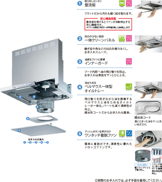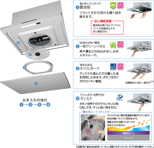 リンナイではオイルスマッシャーディスクという盤がついていて、高速回転をして油汚れの90%をファンの内部に入れない機能のあるレンジフードがあります。汚れはコーティングしたオイルガードと整流板に溜まりますが、さっと洗い流せます。