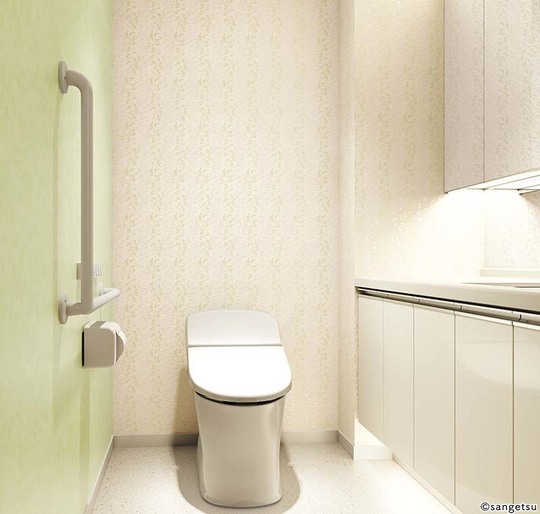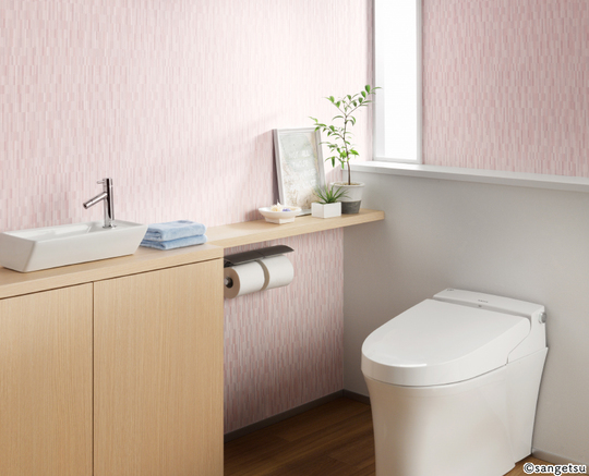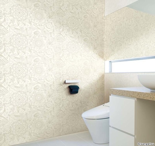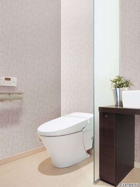 トイレは落ち着いた雰囲気にしたければ淡い色や細かい柄がおすすめです。白は清潔感がありますが、汚れが目立ちやすく、また真っ白な空間は緊張を感じるものです。大きな柄は圧迫感がある場合があります。機能的には、消臭、防水、防カビ効果のあるクロスもあるので、このようなものから選ぶとお掃除が楽になります。