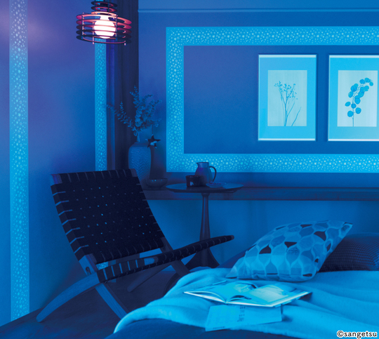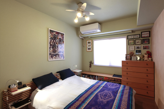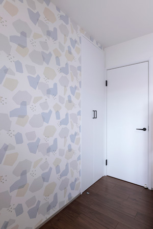 寝室は眠りやくつろぎのための部屋なので、落ち着いたイメージのクロスが向いています。あまり明るい色よりも、多少スモーキーな柔らかなトーンの色を使うと、ほっとできるお部屋になります。ベッドの頭の部分の壁だけアクセントクロスにするのもおしゃれです。