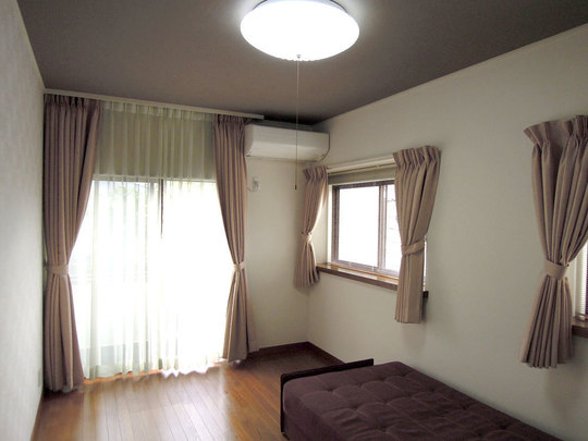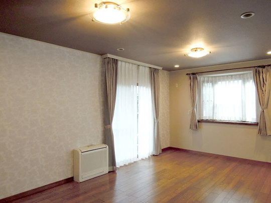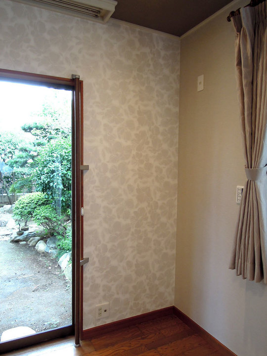 クロスをシックで上品な花柄に張り替えました。カーテンもクロスに色を合わせて新 調。落ち着いたあたたかみのあるお部屋になりました。