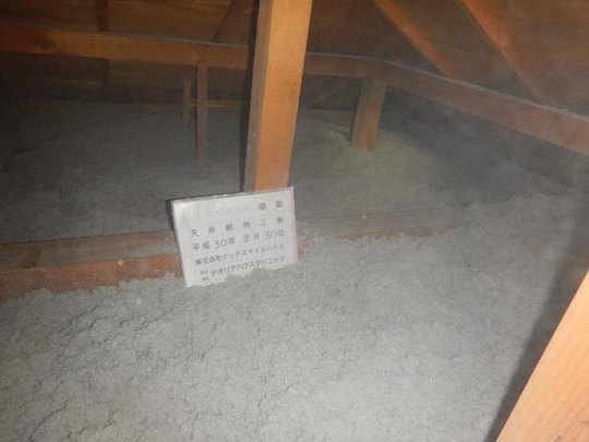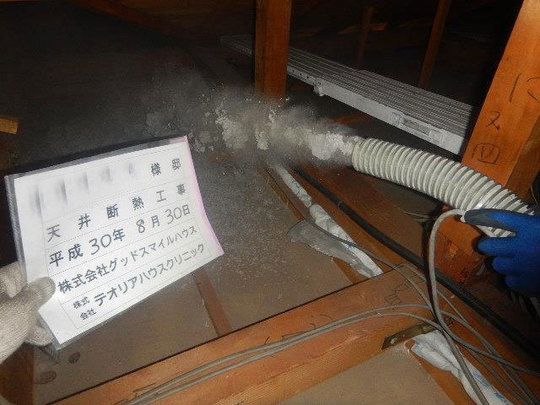 天井裏は、紙を原料とするセルロースファイバーを泡のように隙間なく吹き込む非破壊工法で施工しました。建物を壊すことなく、断熱工事ができます。