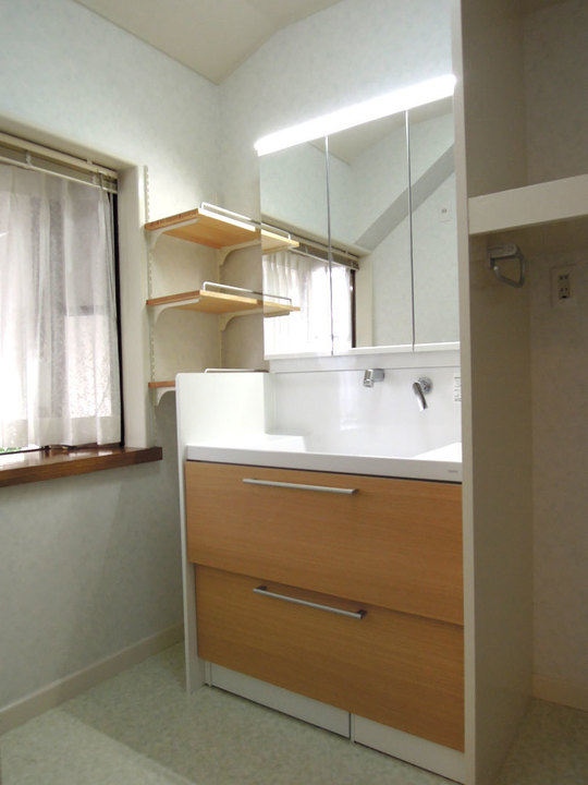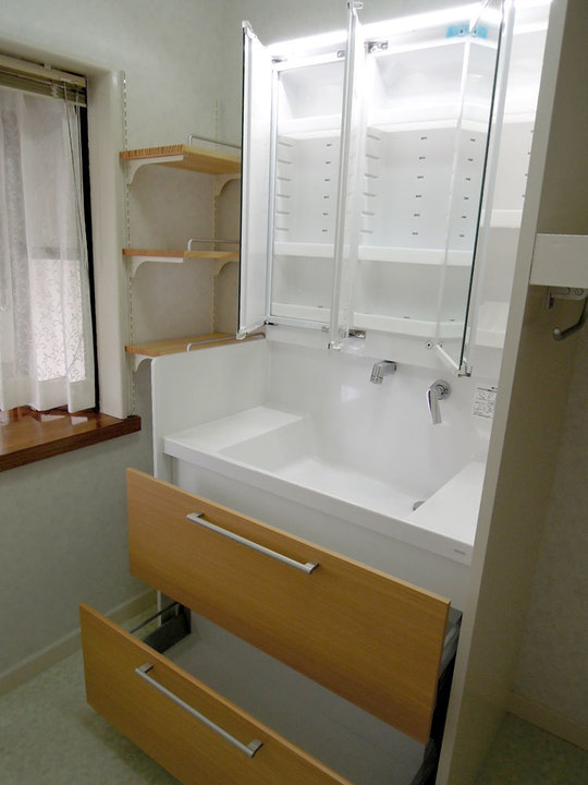コンパクトで収納量のある洗面台に変わりました。左側のクロスも張替え、明るい洗面所になりました。左の空きスペースには、可動式の棚を作りました。洗面ボウルは広く、洗濯なども十分にできます。