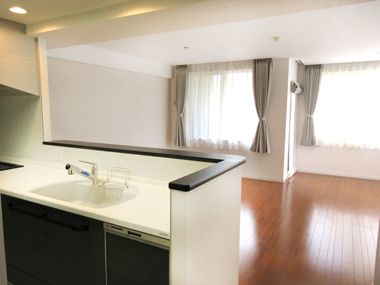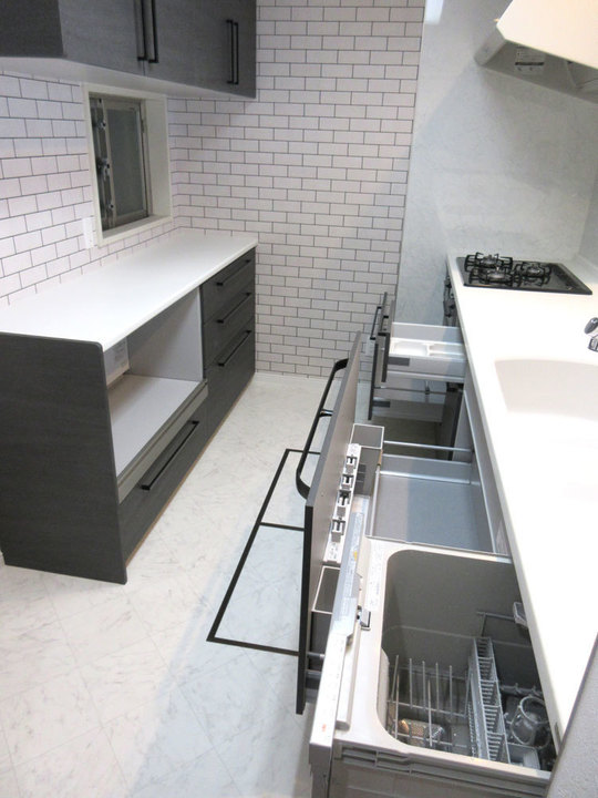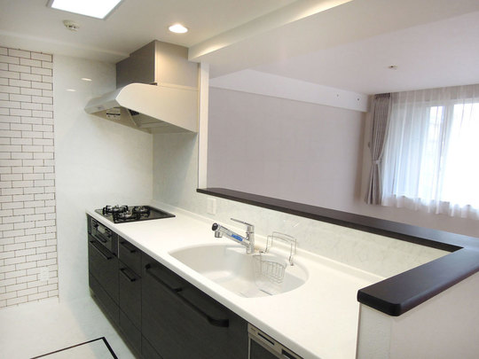 今回のリフォームで背後の壁側に向いていたキッチンを、リビング側の向きに移動しました。黒と白を基調としたモノトーンコーディネートがすてきです。