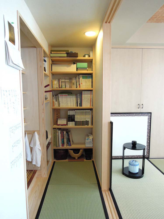 水屋(左)の奥には、茶道の本などが収納できる棚を作りました。棚の最下部と廊下の畳の下には床下収納があります。コンパクトな空間に、お茶関係の備品がすっきりと収まりました。