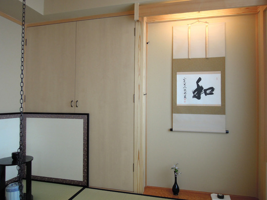 お話をうかがったあと、H様にお茶を点てていただきました。真新しいお茶室に座っていると、ここがマンションであることを忘れてしまいます。やさしくお作法を教えて頂き、おいしいお抹茶とお菓子をいただきました。