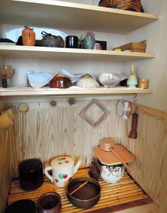 棚には、美しい茶道具が並べられ、竹のすのこの下には簡易排水のたらいを設置し、水を流せるようにしました。