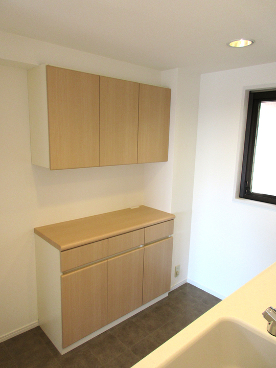 キッチンの備え付け収納に明るい木目のダイノックシートを施工。キッチンがナチュラルなイメージになりました。
