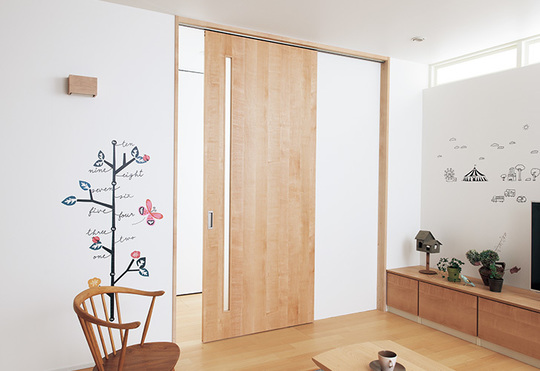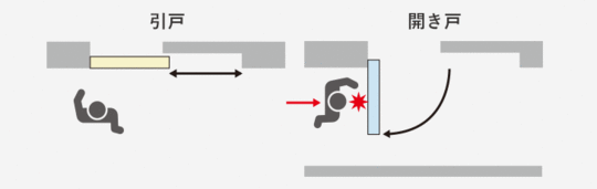 引き戸は、開口部を広くとったり、前後に開閉スペースを必要としないので、部屋が広く使えます。また開け放つことができるので、ドアのように風でバタンと閉まってしまったり、ドアが急に開いて近くにいる人にぶつかるようなこともありません。前後が狭いスペースや、車いすが通りやすいバリアフリーの出入口にも向いています。